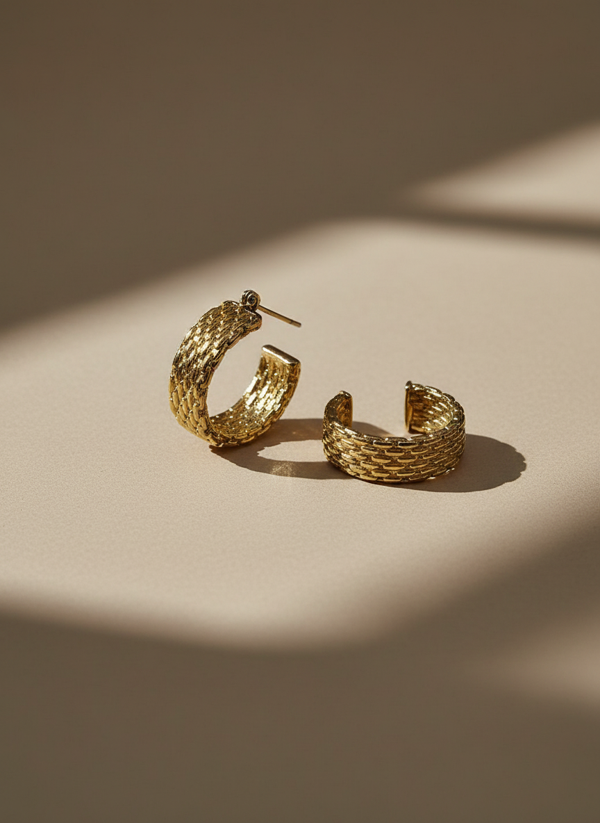 Elegante textured hoops oorbellen in goud met uniek gevlochten/basket weave patroon. Deze statement hoops hebben een prachtige gestructureerde afwerking die licht prachtig vangt.