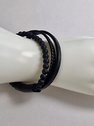 Deze stijlvolle armband combineert robuust gevlochten leer met elegante matte zwarte kralen. Het perfecte accessoire voor de moderne man die van een stoere maar verfijnde look houdt.