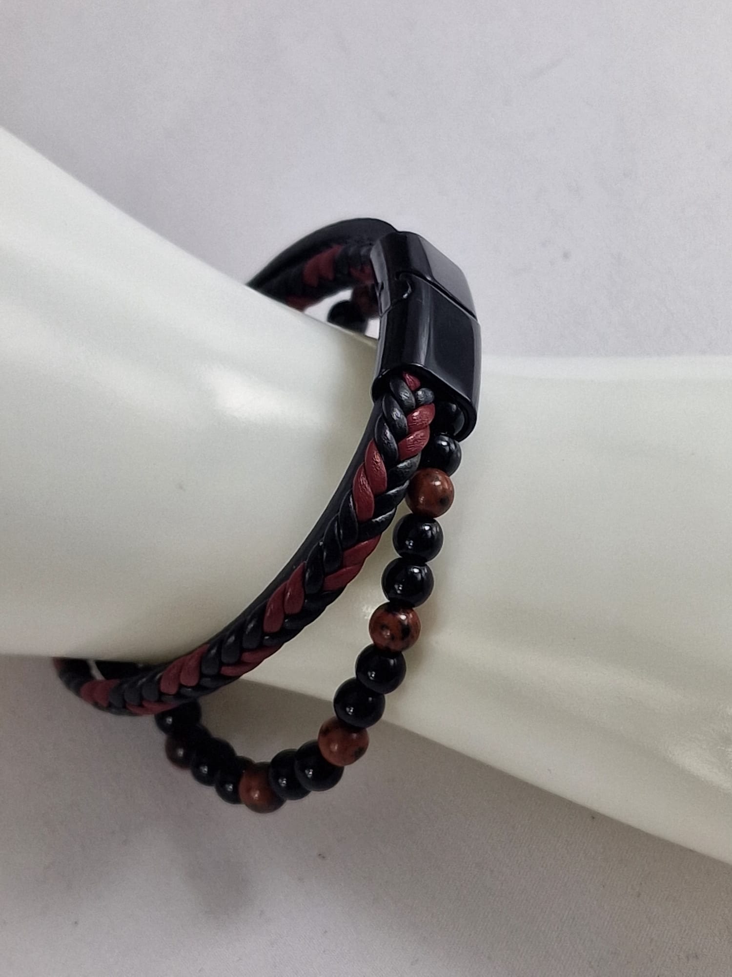 - 🔴 Gevlochten armband in zwart en bordeauxrood leer