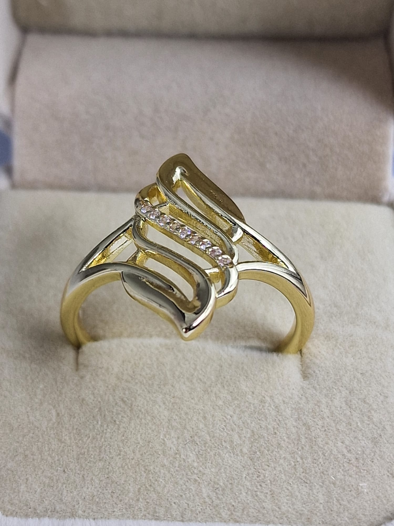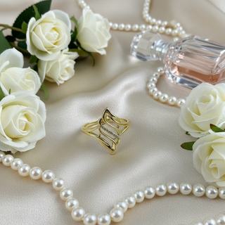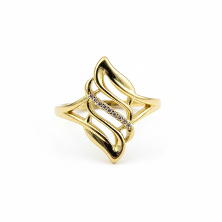 Elegante dames ring met een verfijnd design, versierd met fonkelende steentjes. Deze prachtige ring is gemaakt van 14K verguld materiaal en heeft een opvallend, modern design dat perfect is voor speciale gelegenheden of om je dagelijkse look te verrijken.