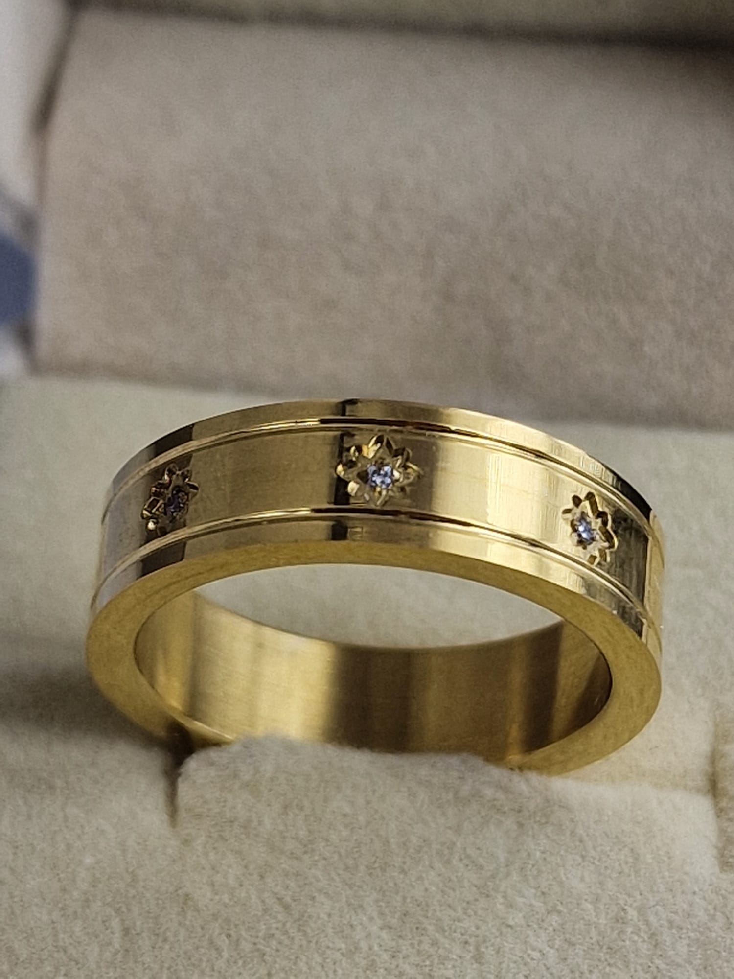 Luxe dames ring gemaakt van hoogwaardig 18K verguld roestvrij staal, versierd met fonkelende zirkonia steentjes. Het elegante design met dubbele band en subtiele steentjes maakt deze ring perfect voor zowel dagelijks gebruik als speciale gelegenheden.