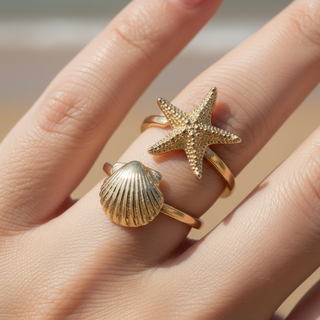 Deze ring is perfect voor de vrouw die van de zee en het strand houdt. De zeester en schelp zijn symbolen van de oceaan, vrijheid en natuurlijke schoonheid. Draag deze ring en voel je altijd verbonden met de zee!