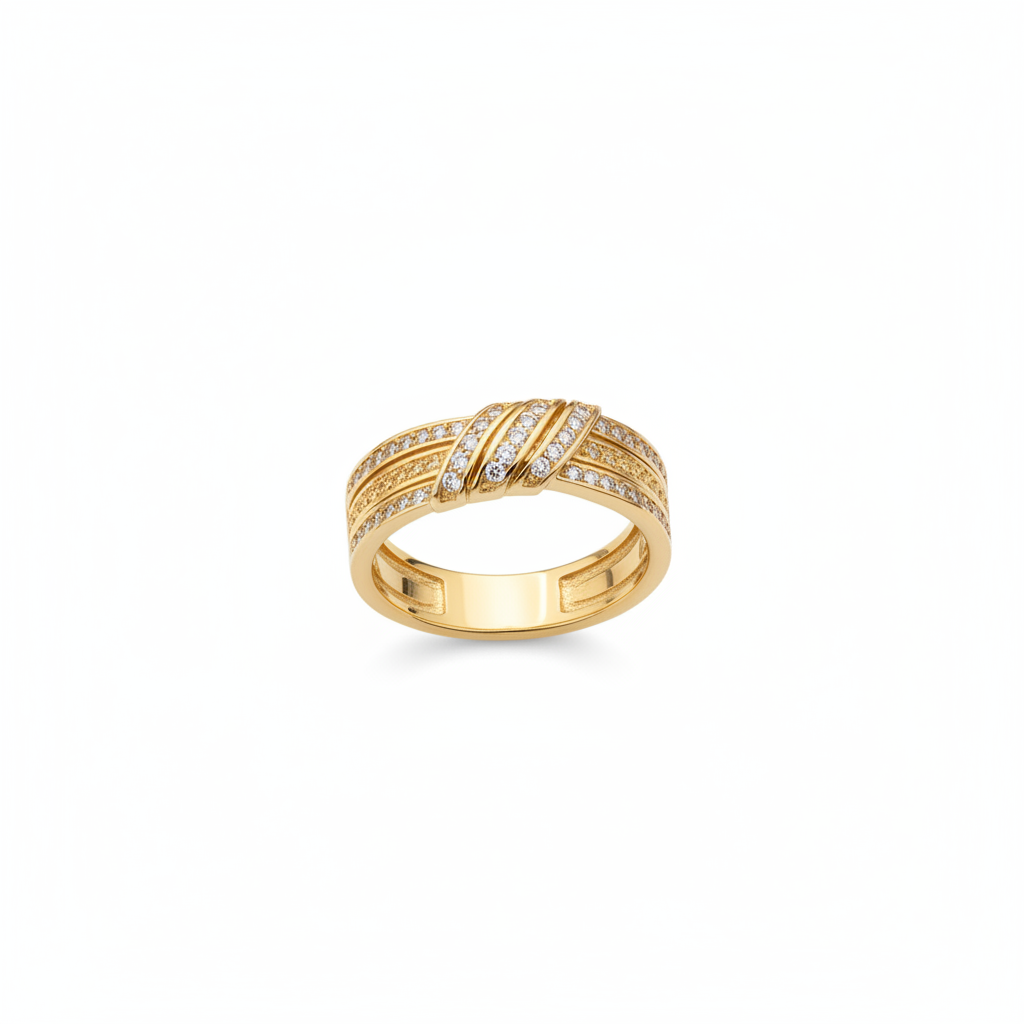 Prachtige dames ring in goudkleur met meerdere rijen fonkelende zirkonia steentjes. Het elegante, gevlochten design geeft deze ring een luxe uitstraling die perfect is voor zowel dagelijks gebruik als speciale gelegenheden.