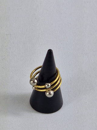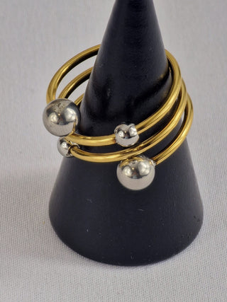 Trendy en opvallende spiral ring met gouden banden en zilveren bolletjes. Deze moderne statement ring is gemaakt van hoogwaardig roestvrij staal en is volledig waterproof. Perfect voor de vrouw die van unieke en speelse sieraden houdt.