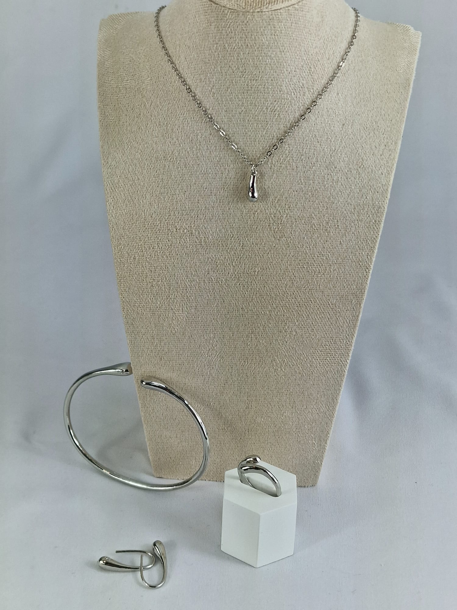Elegante 4-delige sieradenset met trendy waterdruppel design. Deze bestseller set bestaat uit een halsketting, oorbellen, ring en armband, perfect om samen te dragen of apart te combineren.