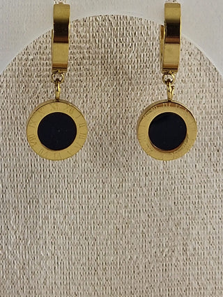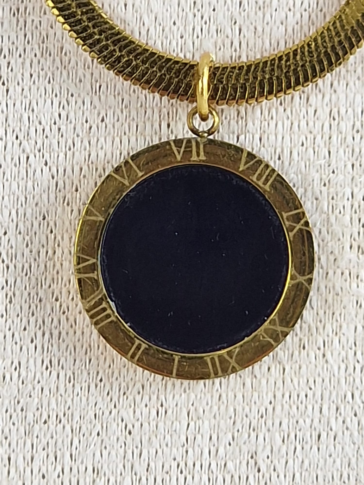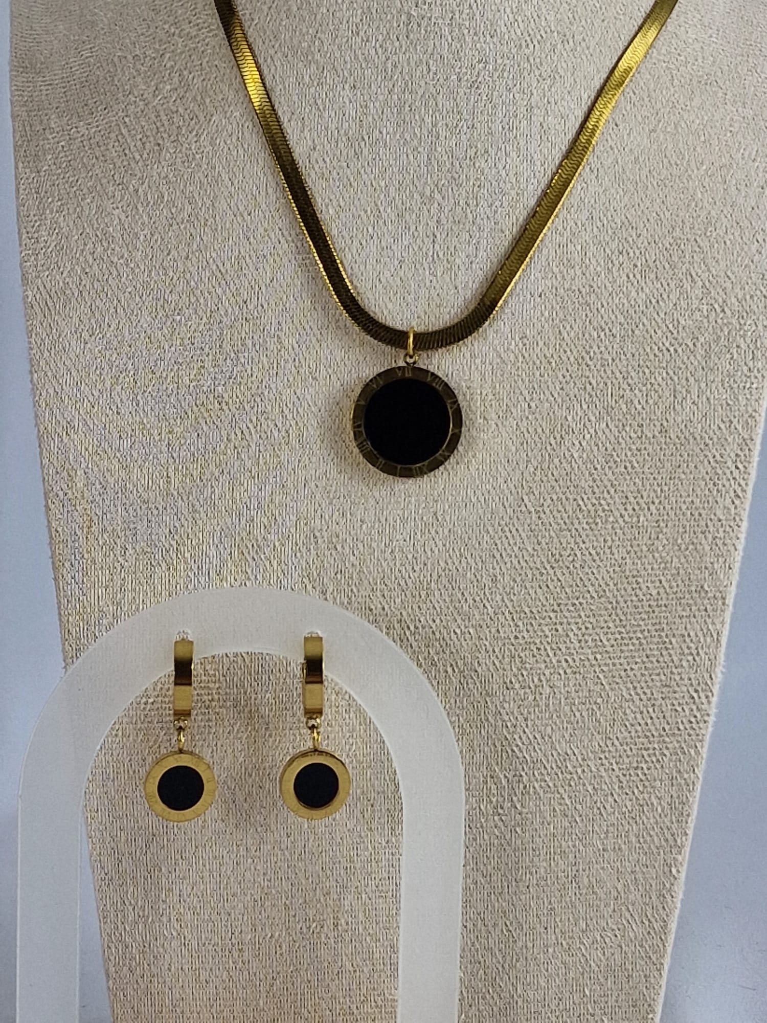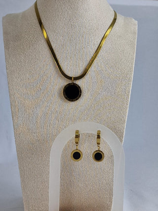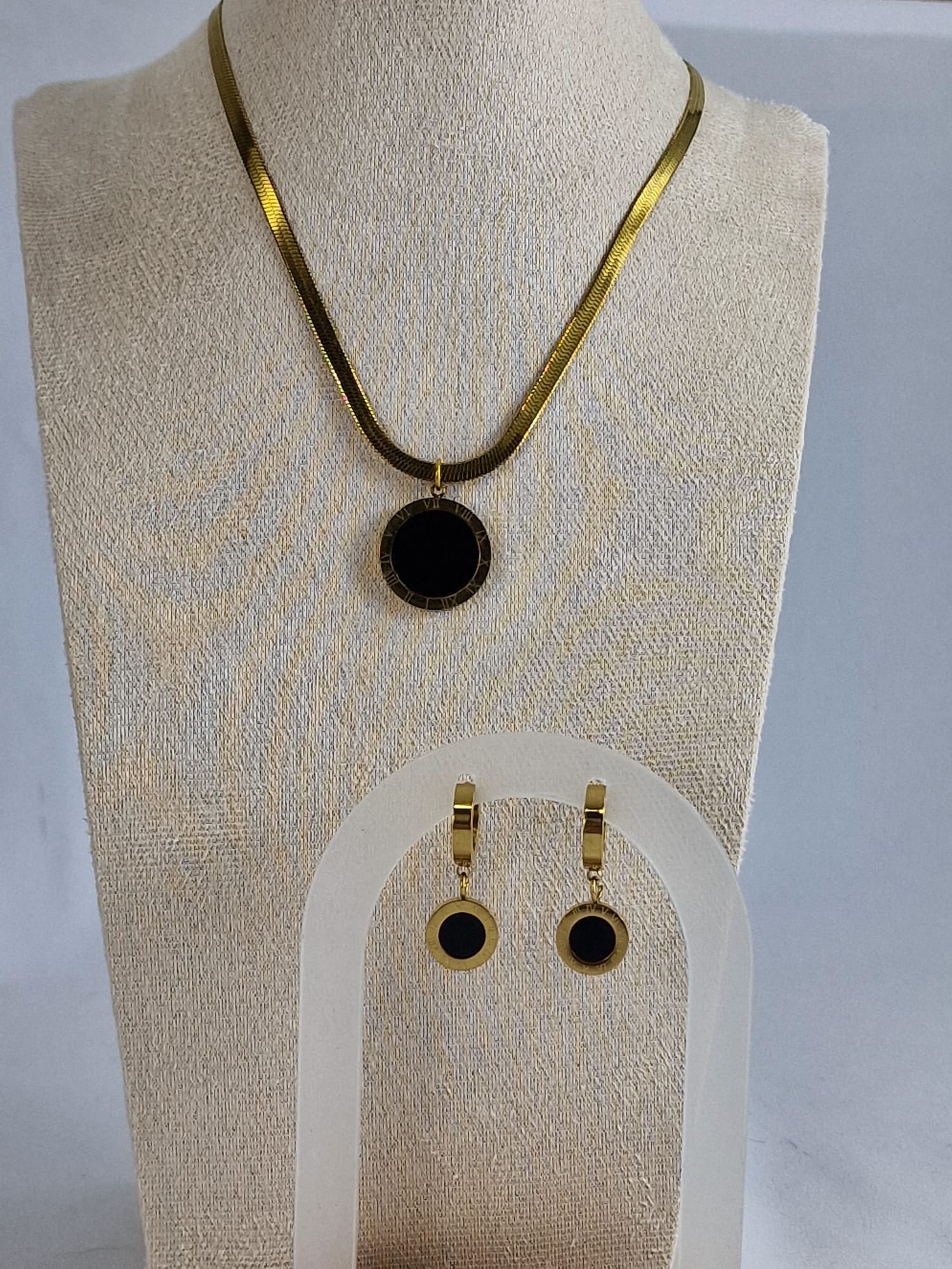 Elegante 2-delige sieraden set van hoogwaardig roestvrijstaal met prachtige zwarte stenen. Deze stijlvolle set bestaat uit een gouden ketting met ronde zwarte steen hanger en bijpassende oorbellen.