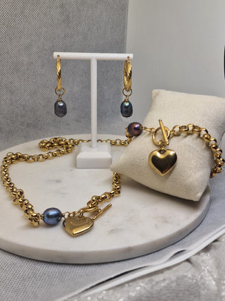 Een complete en stijlvolle sieradenset van hoogwaardig roestvrij staal, verguld met 18 karaat goud. De set bestaat uit een collier, bijpassende armband en oorbellen, allen afgewerkt met een elegante hart hanger en subtiele parelaccenten.