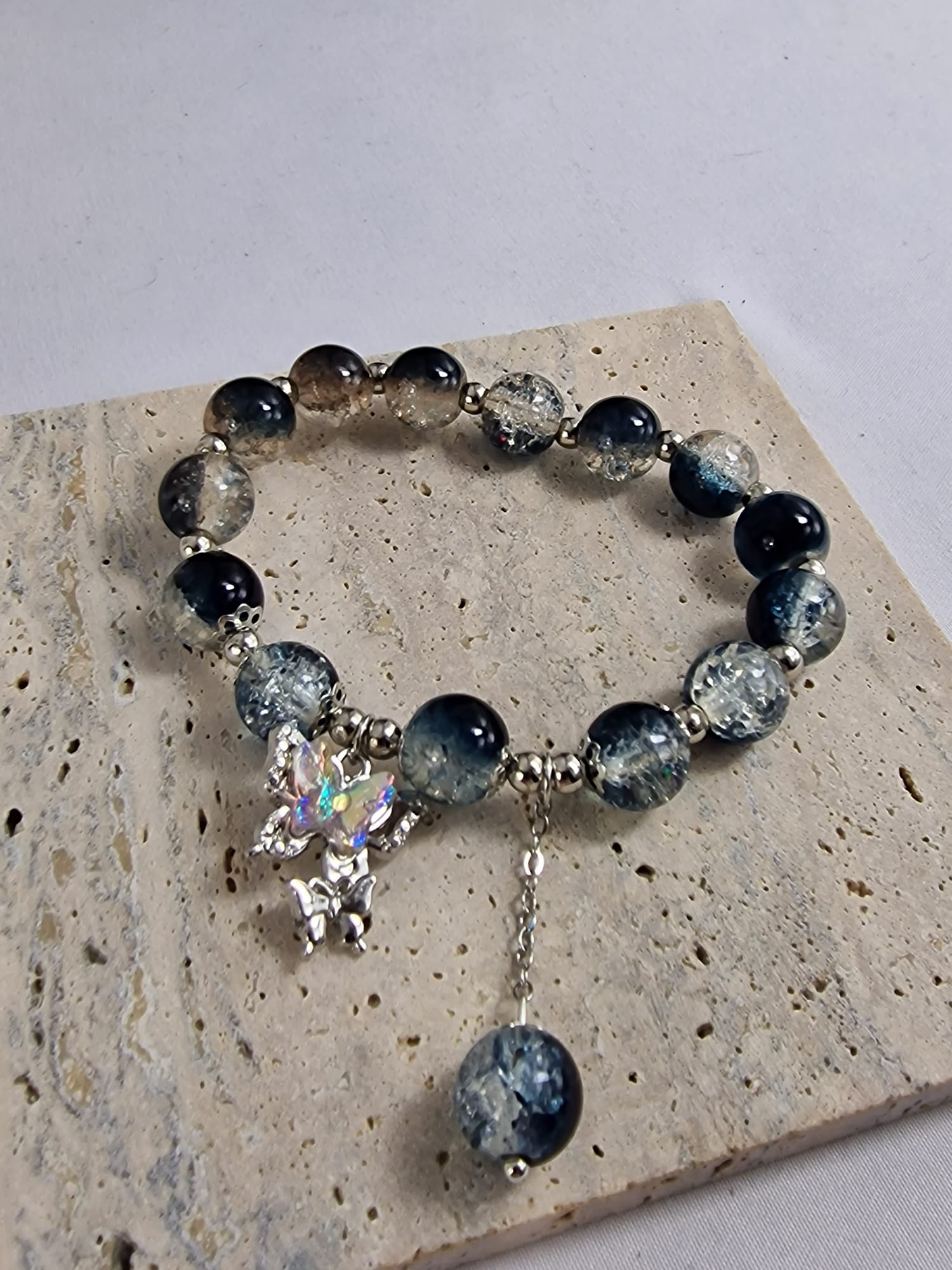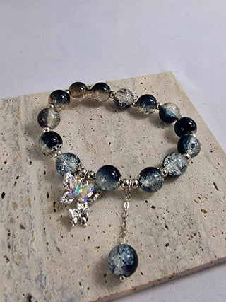 Mystieke kristallen armband in blauw en zwart met regenboog kristal bedel
