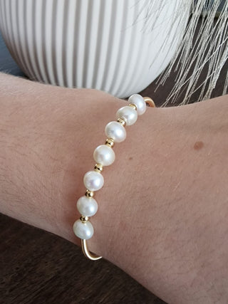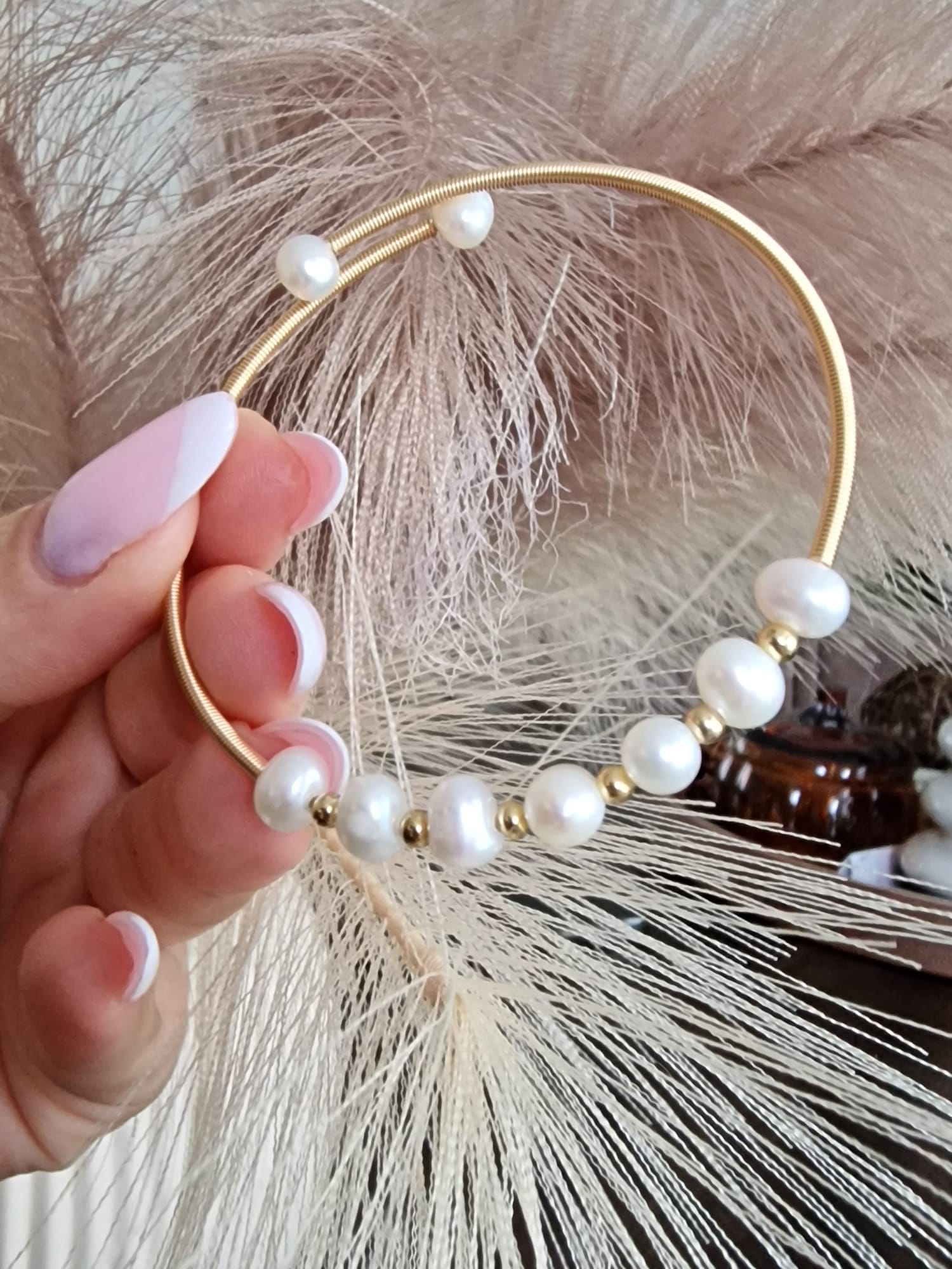 Elegantes Armband mit echten Süßwasserperlen und verstellbarer Öffnung. Die Kombination aus glänzenden Perlen und goldenen Details verleiht diesem Armband einen luxuriösen und zeitlosen Look. Perfekt für jeden Tag und besondere Anlässe.