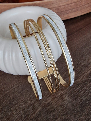 Elegantes und modernes Armband mit offenem Design, vergoldet und mit dezenten silbernen Akzenten verziert. Der spielerische Kontrast zwischen glänzenden und matten Details verleiht diesem Armband einen luxuriösen Look, der sowohl zu Alltagsoutfits als auch zu besonderen Anlässen passt.