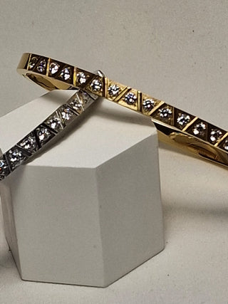 Elegantes Damenarmband aus Edelstahl mit funkelnden Zirkonia-Steinen und stilvollen Dreiecksdetails. Dieses moderne Armband ist in zwei wunderschönen Farben erhältlich und passt perfekt zu jedem Outfit.