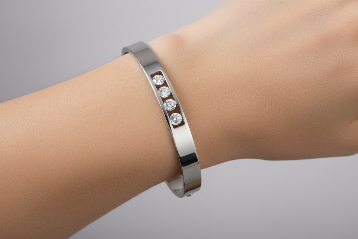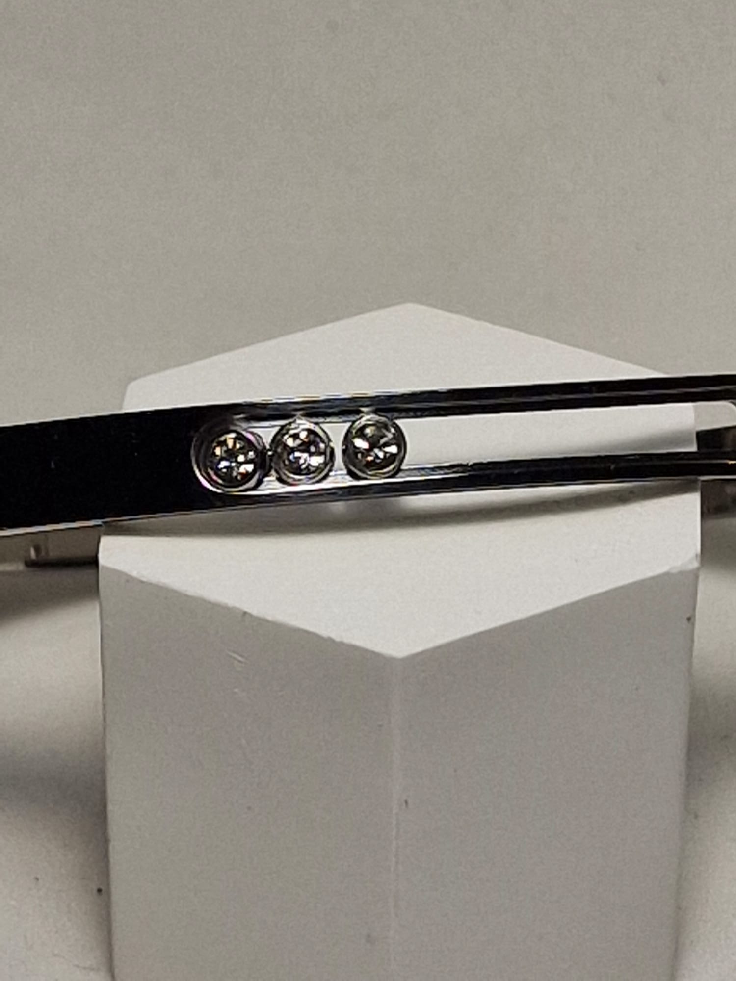 Elegante slavenarmband in roestvrijstaal met zilverkleur en een uniek design met 3 schuifbare zirkonia stenen. Deze moderne armband heeft een rechthoekige opening aan de bovenkant waardoor je de zirkonia stenen kunt verplaatsen voor een speelse, persoonlijke touch.