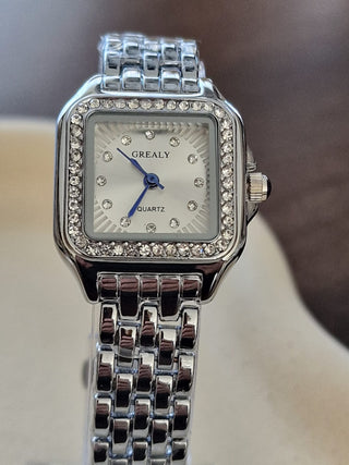 Eine Uhr, die wie ein Juwel funkelt. Das quadratische Gehäuse mit glitzernden Strasssteinen verleiht diesem klassischen Modell einen luxuriösen Look. Das silberne Armband und die römischen Ziffern machen sie zur perfekten Verbindung von Stil und Eleganz.