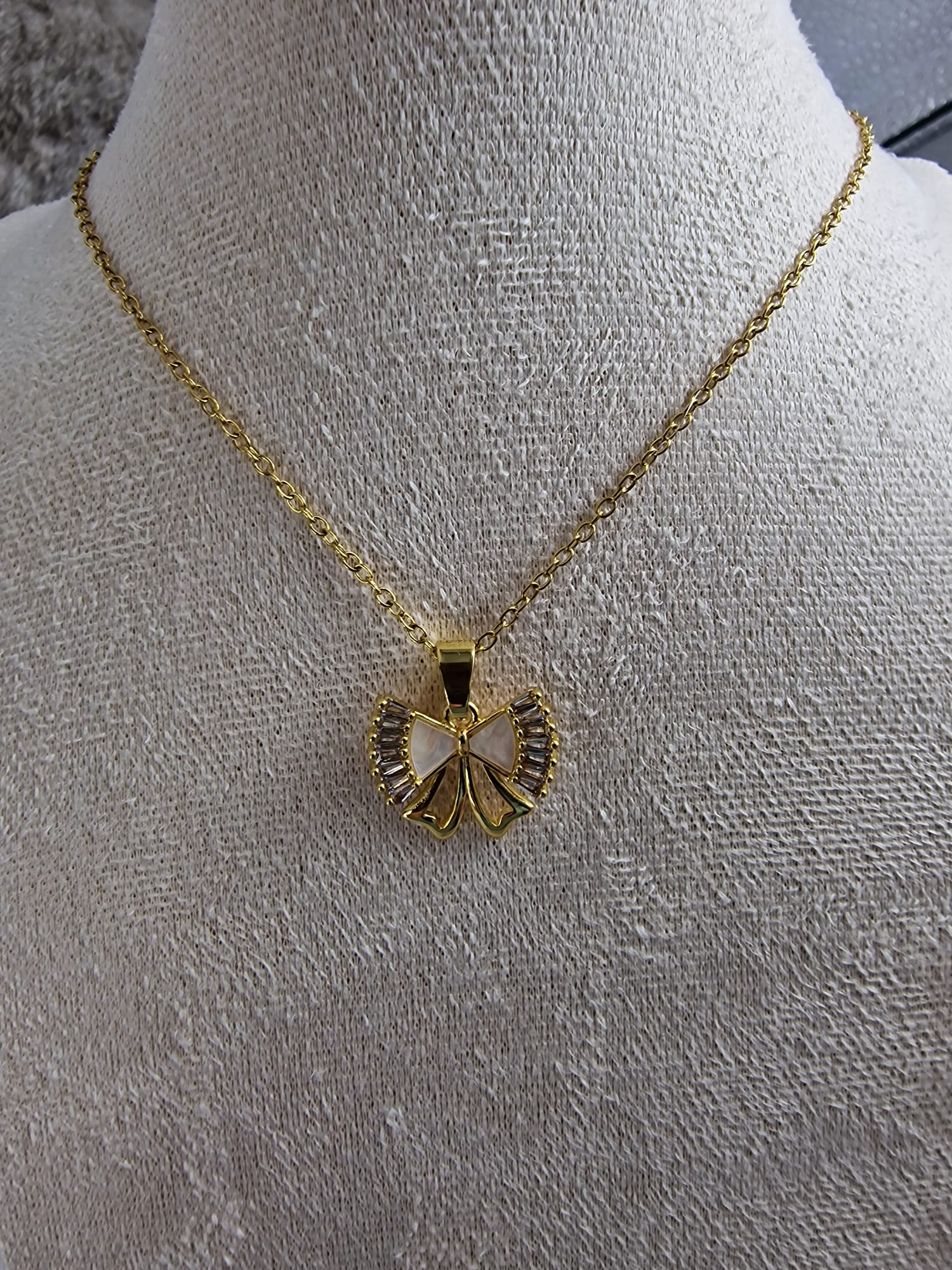De gouden afwerking en de fonkelende steentjes geven deze ketting een luxe uitstraling. Het strikje motief voegt een speelse en vrouwelijke touch toe aan elke outfit. Draag deze ketting solo voor een subtiele elegantie of combineer met andere sieraden voor een gelaagde look!