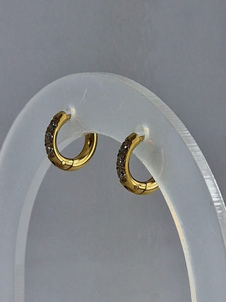 Elegante gouden creolen met schitterende witte zirkonia stenen. Deze stijlvolle oorbellen zijn gemaakt van hoogwaardig roestvrijstaal met 18K goudverguld voor een luxe uitstraling.