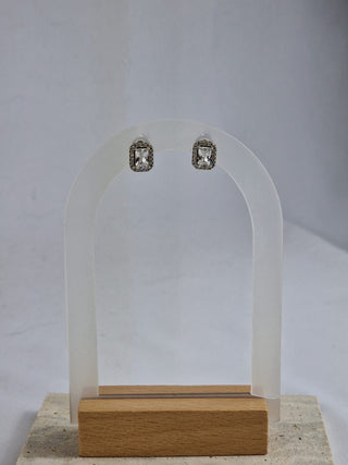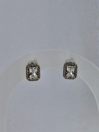 Zeer elegante en delicate oorknopjes voor dames met een centrale baguette geslepen zirkoon steen omringd door schitterende ronde mini zirkoon steentjes. Een verfijnd sieraad dat luxe en elegantie uitstraalt.