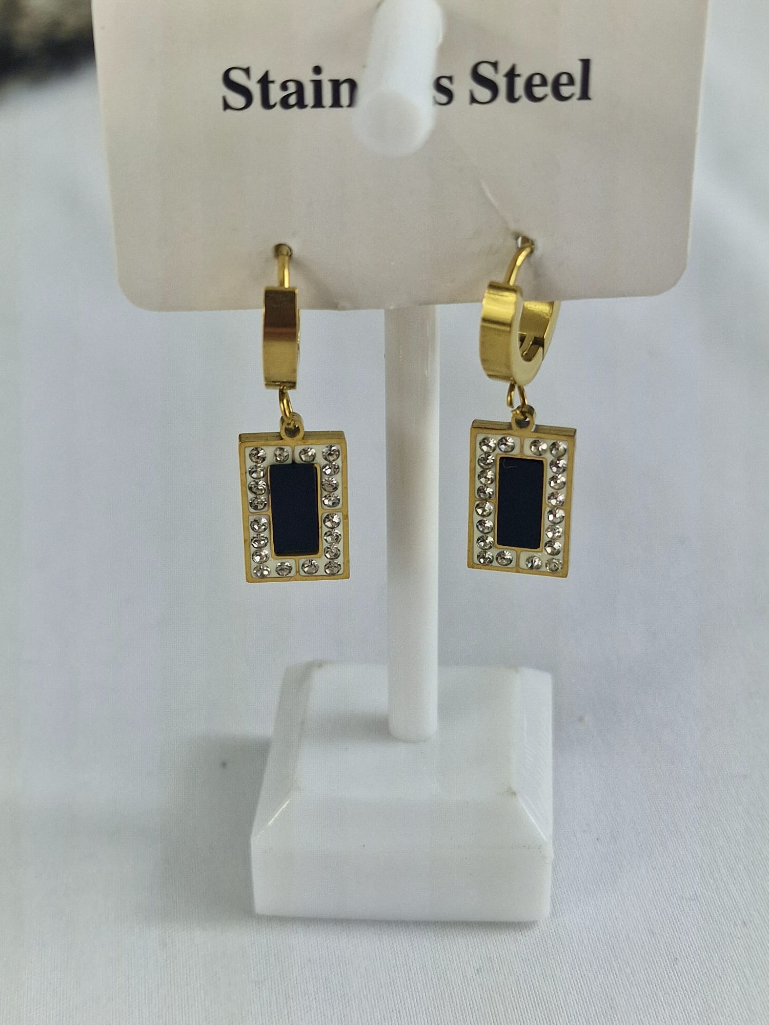 Elegante Hängeohrringe aus hochwertigem Edelstahl mit 18-karätiger Vergoldung. Diese wunderschönen Ohrringe sind mit weißen Zirkonia-Steinen besetzt und bestechen durch einen markanten schwarzen Zirkonia in der Mitte. Perfekt für besondere Anlässe und einen luxuriösen Look.