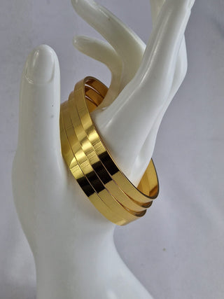 Ontdek onze modieuze set van 4 licht luxe armbanden in prachtig 14K verguld goud met een elegante vlakke vorm. Perfect om te stapelen of apart te dragen!