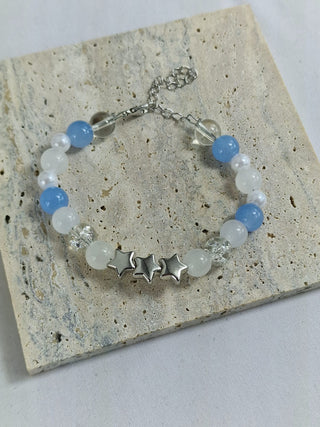 Droom weg met deze betoverende armband die de schoonheid van de hemel naar je pols brengt. De zachte blauwtinten en heldere witte kralen worden prachtig geaccentueerd door drie glanzende zilveren sterren.