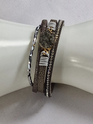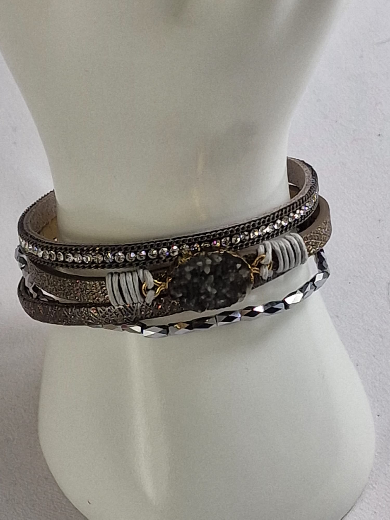 - Boho Leren Dames Armband - Grijs met Kristaldetails