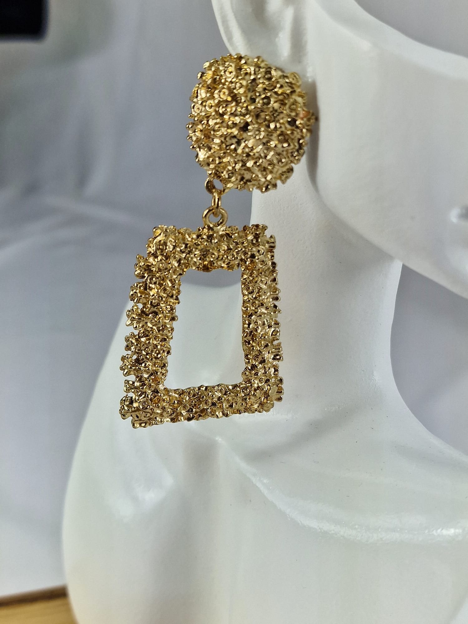 Deze oorbellen zijn echte eyecatchers die je outfit naar een hoger niveau tillen. De getextureerde afwerking vangt het licht op een prachtige manier, waardoor de oorbellen schitteren bij elke beweging. Het geometrische design is modern en tijdloos tegelijk.