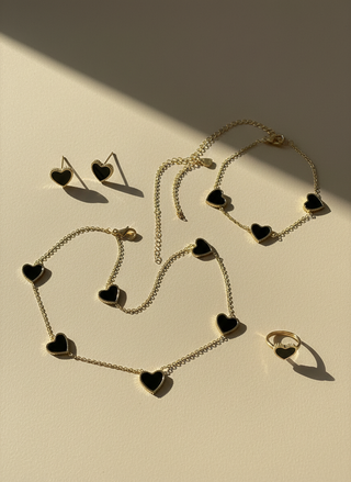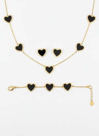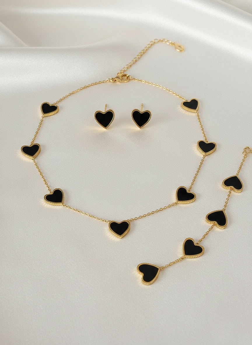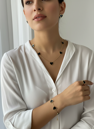 Elegante 3-delige sieradenset met zwarte hartjes in goud. Set bevat ketting, oorstekers én armband. 18K verguld roestvrij staal met zwarte emaille hartjes. Perfect voor dagelijks gebruik of als cadeau. Hypoallergeen en waterdicht.