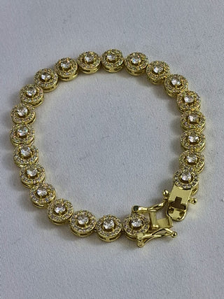 Deze elegante schakelarmband heeft in elke schakel een glinsterende kristal steen die prachtig schittert. De goudkleurige afwerking en de klassieke schakelstructuur geven een tijdloze en luxe uitstraling. Perfect voor speciale gelegenheden of om je dagelijkse outfit een glamorous touch te geven!